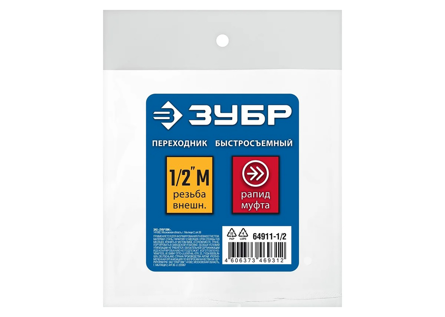 Переходник 1/4″M – рапид муфта ЗУБР Профессионал 64911-1/4